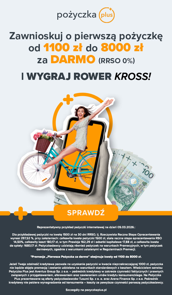 W piątek (10.04) nastąpi zmiana komunikacji na Pożyczce PLUS na konkursową pt. „Wiosenny start na PLUS!”. Do wygrania jest rower KROSS o wartości 2000 zł.