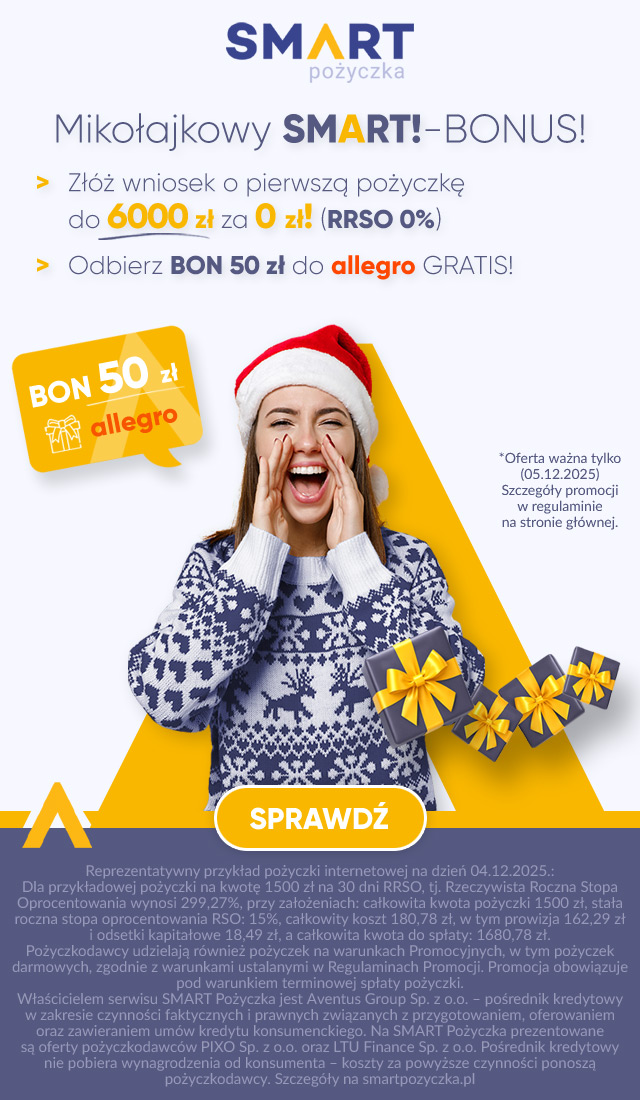 W dniu 05.12 (piątek) organizowana będzie promocja jednodniowa na SMART Pożyczka Hasło to: Mikołajkowy SMART-Bonus