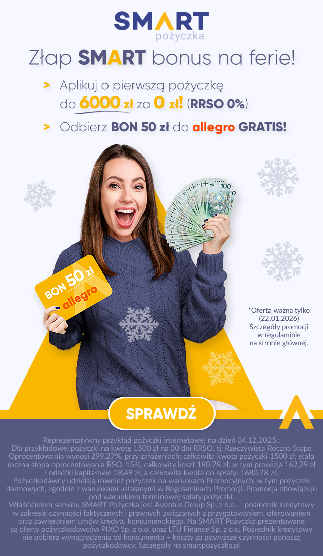 20 stycznia 2026 Piotr Winiarz SMART Pożyczka „Złap SMART-bonus na ferie!” W dniu 22.01 organizowana jest promocja jednodniowa dla nowego klienta. Hasłem promocyjnym jest: Złap SMART-bonus na ferie! Kreacja i Regulamin do pobrania: Mailing 1 Regulamin Zapraszamy!
